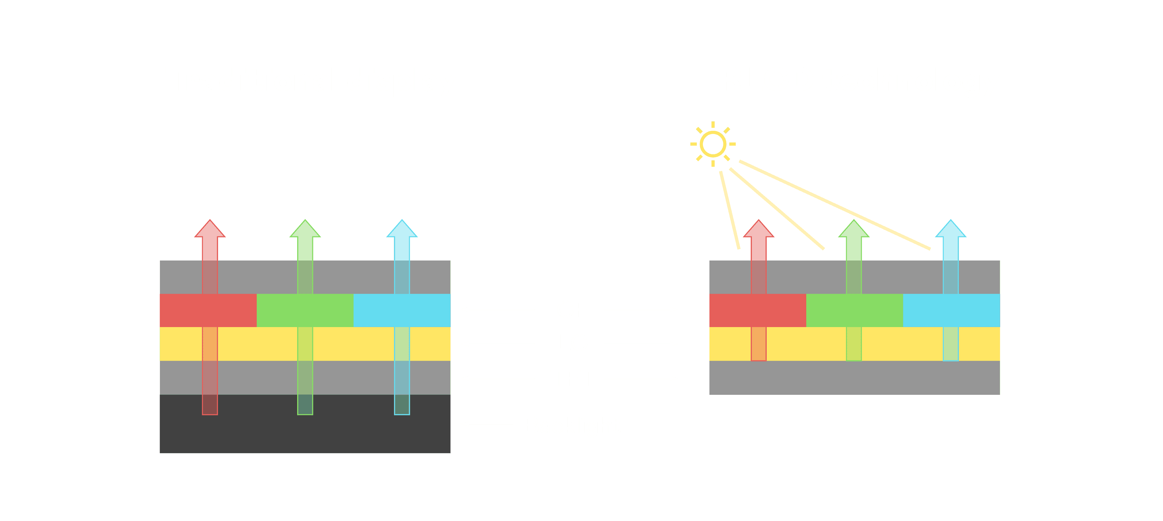 与传统需搭配背光单元的液晶显示相比,,,反射式液晶技术不仅更省电、、、更轻薄,,且即便在艳阳下仍能清晰显示。。此外,,,少了背光单元,,,,也大幅降低了 LED 蓝光伤害眼睛的疑虑。。